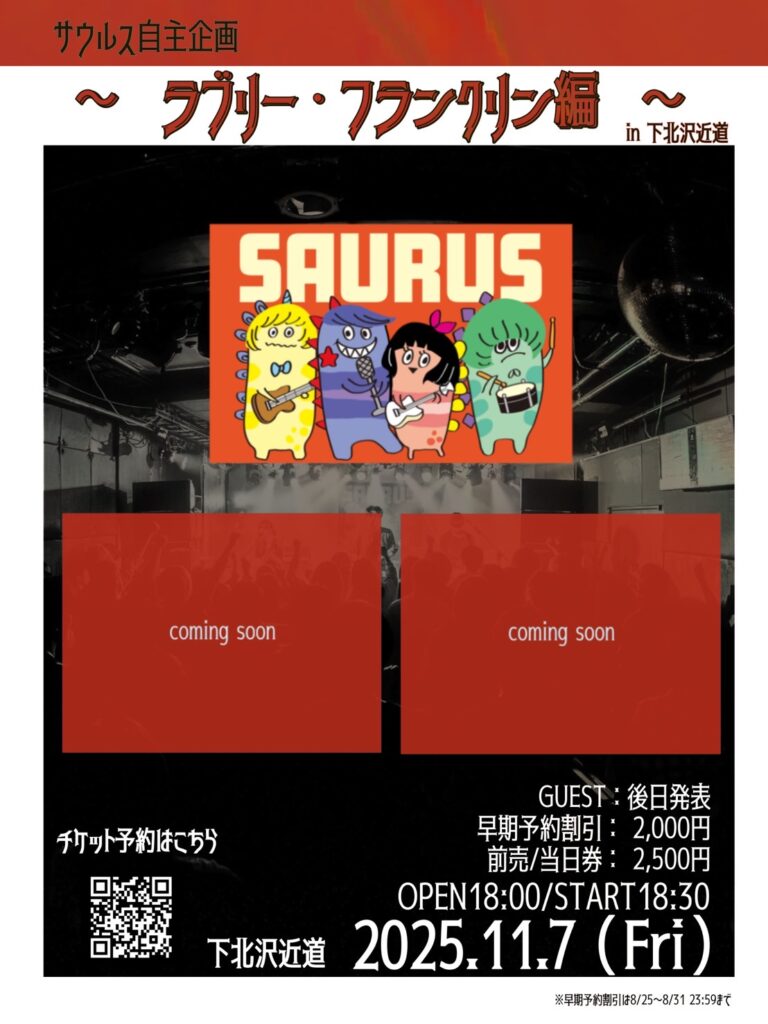 イベントタイトルは「サウルス自主企画 ラブリー・フランクリン編 in 下北沢近道」。下北沢という彼らの原点の街を舞台に、ジャンルやキャリアを超えたバンドたちとの共演を通じて、これまで培ってきた経験と成長をステージで余すことなく解き放つ。共演者は後日発表される。